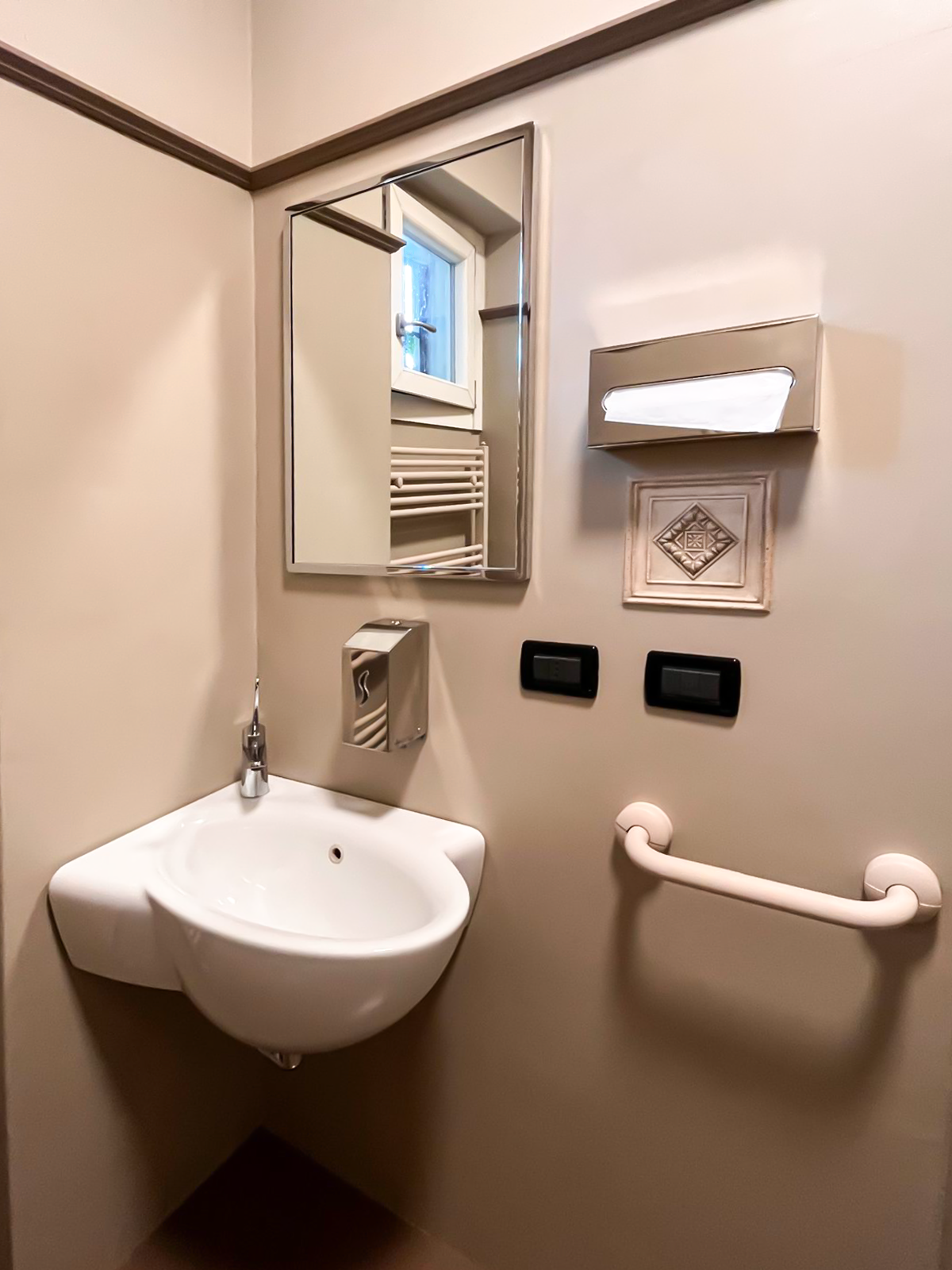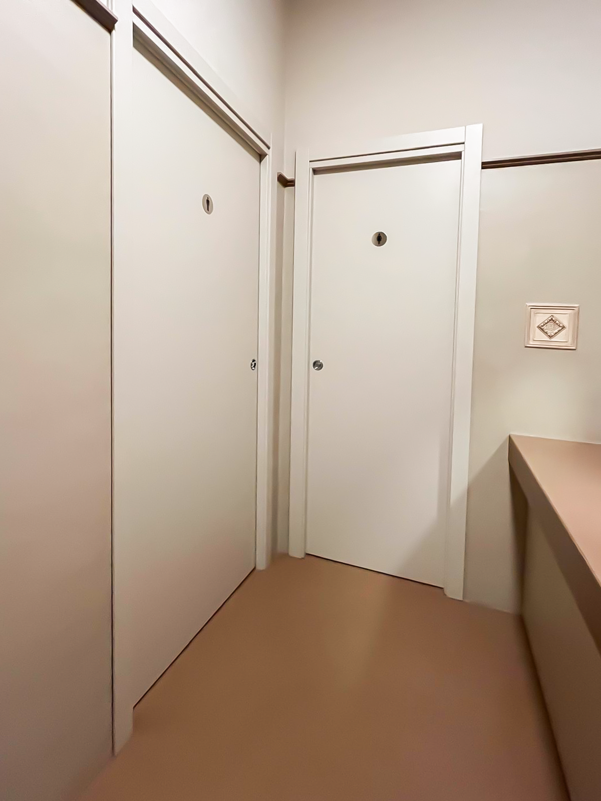 All’ingresso è stato installato un sistema di pannelli ispezionabili, progettati per garantire accessibilità tecnica e un risultato visivo pulito. Il vecchio top in marmo è stato rivestito con un piano in legno, come anche i due pannelli sottostanti, successivamente trattati in resina per assicurare resistenza e uniformità materica.