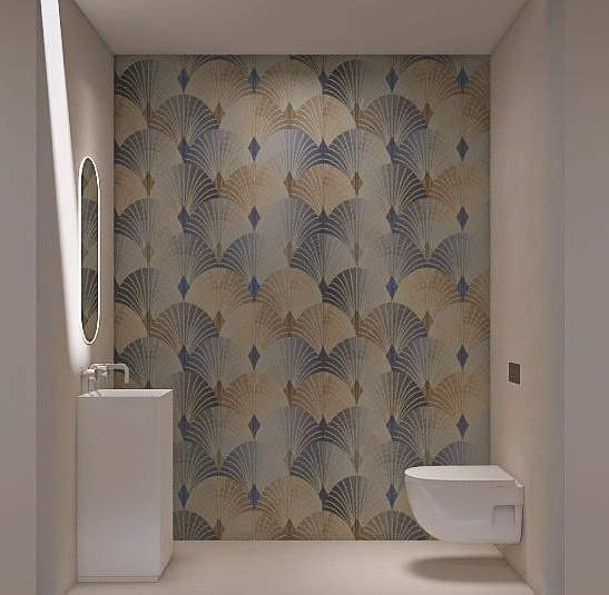 Un bagno raffinato e accogliente, caratterizzato da un lavabo da terra di design che unisce funzionalità ed estetica. La parete decorata con carta da parati dona carattere e stile, creando un ambiente originale e piacevole per gli ospiti.