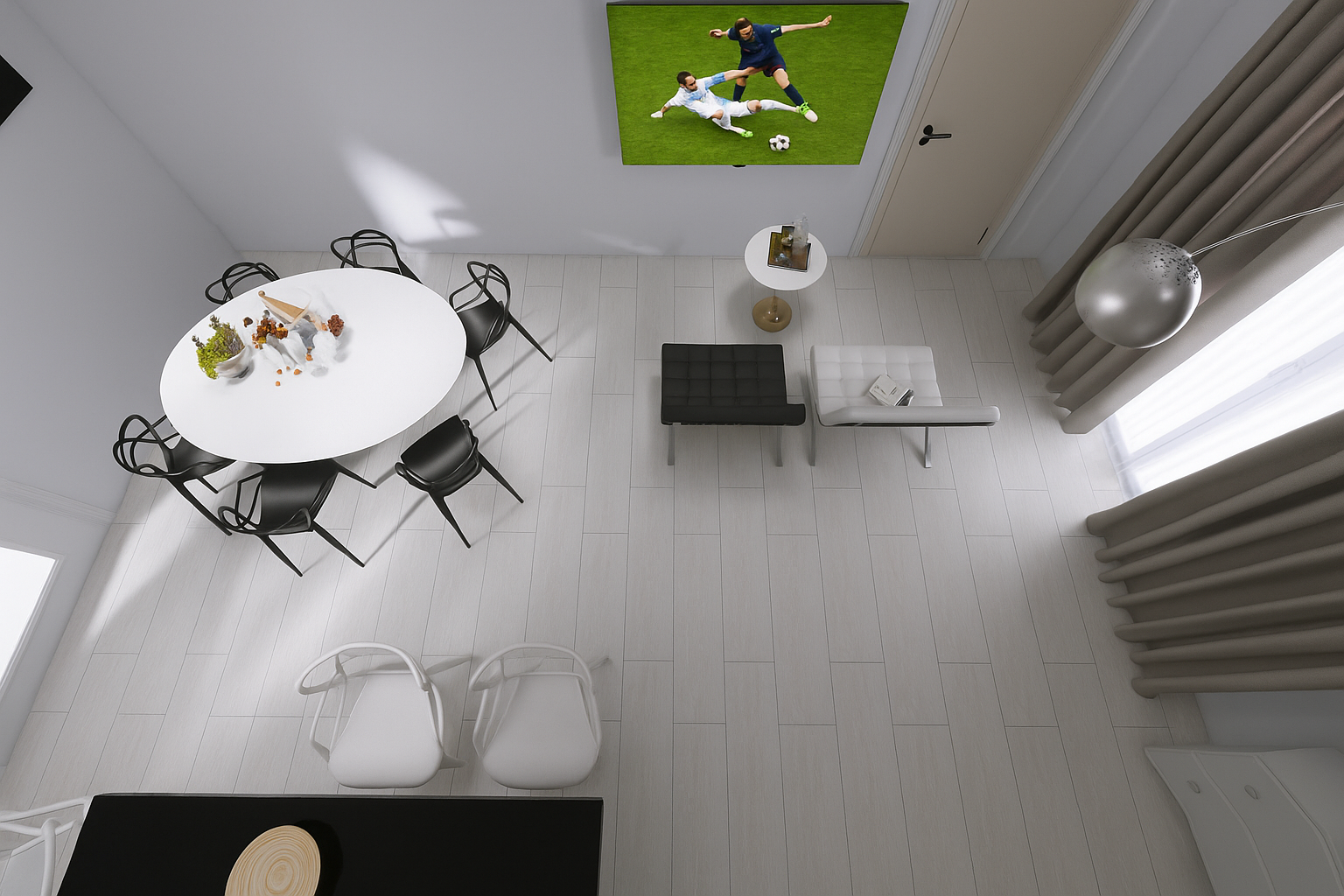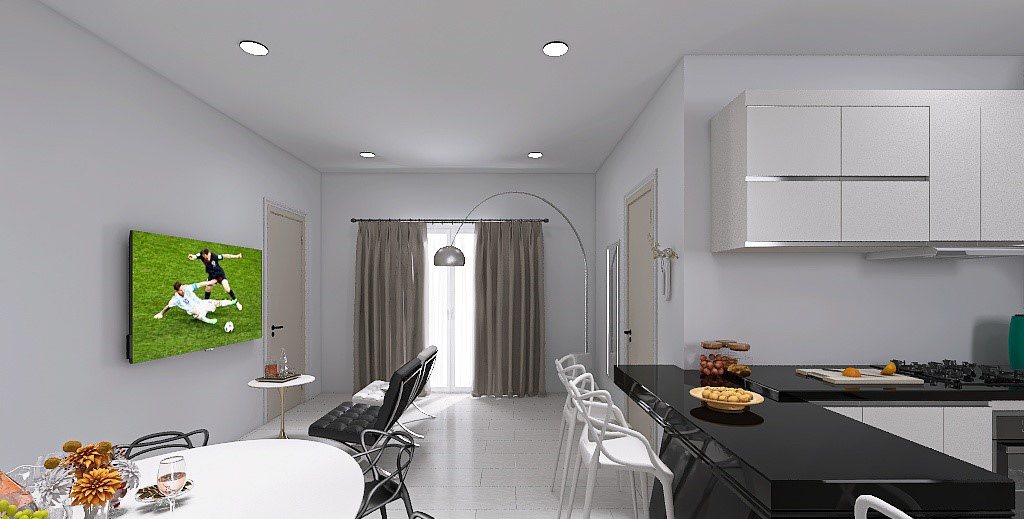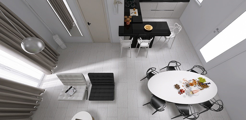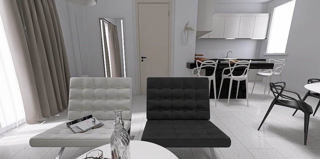 Spazio living dal carattere contemporaneo, perfetto per accogliere amici o momenti di relax. Le poltrone Barcelona, il tavolo Tulip e la lampada ad arco rendono il salotto elegante, confortevole e iconico.