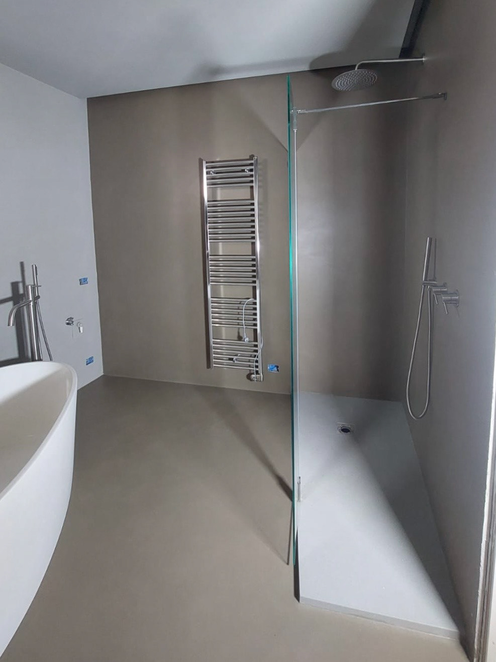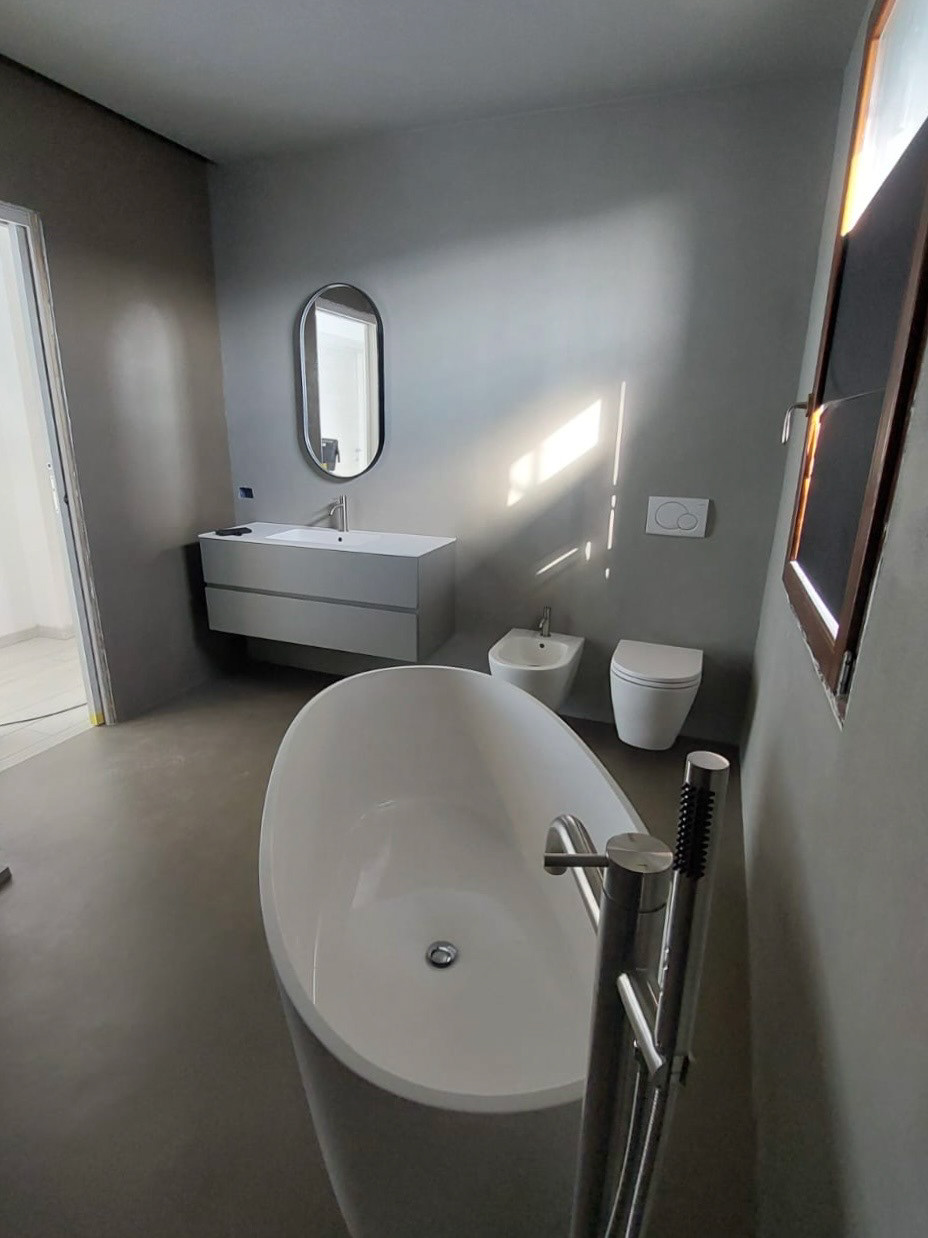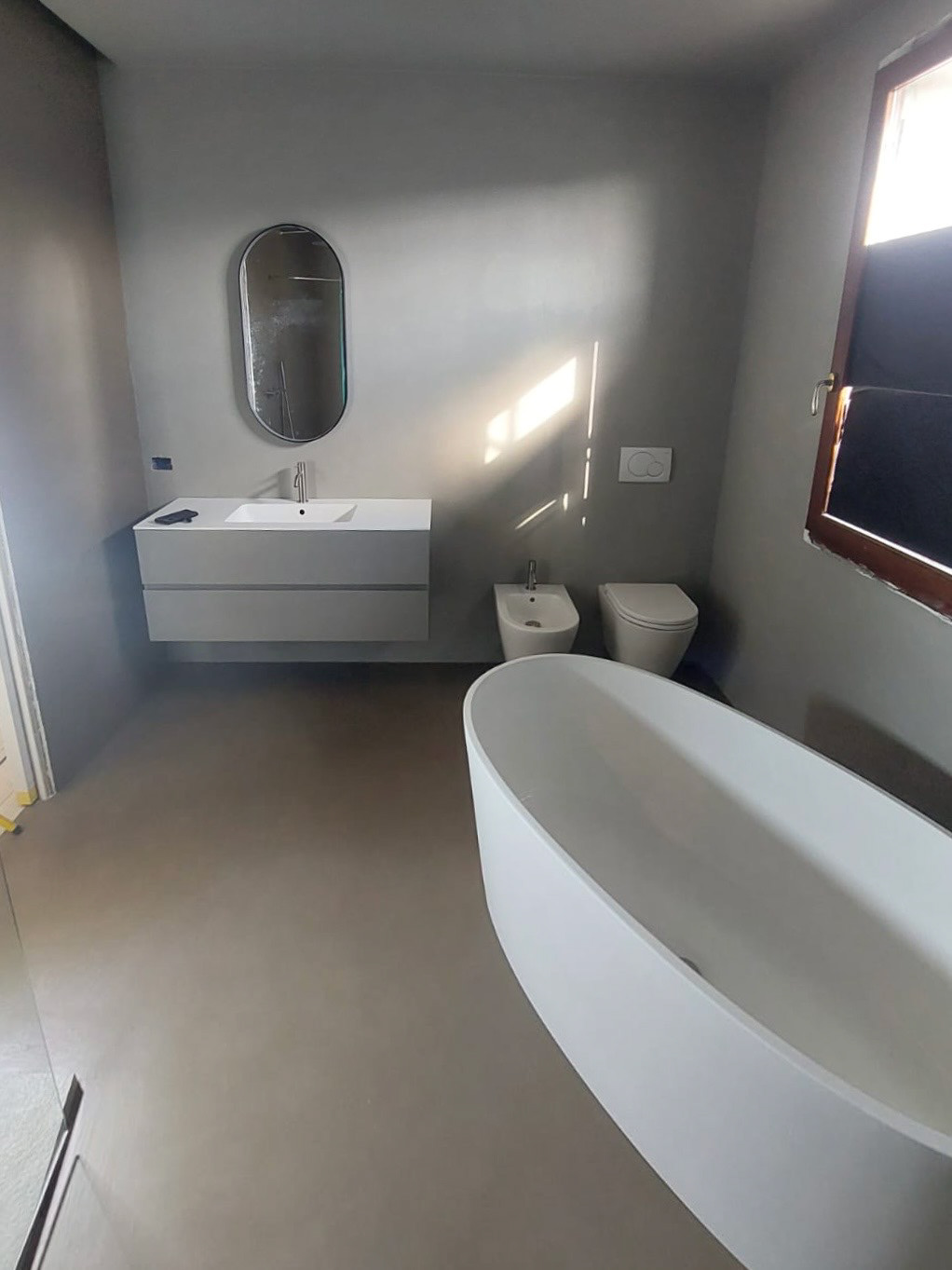 Bagno realizzato in microcemento, con superfici uniformi, resistenti e facili da pulire.