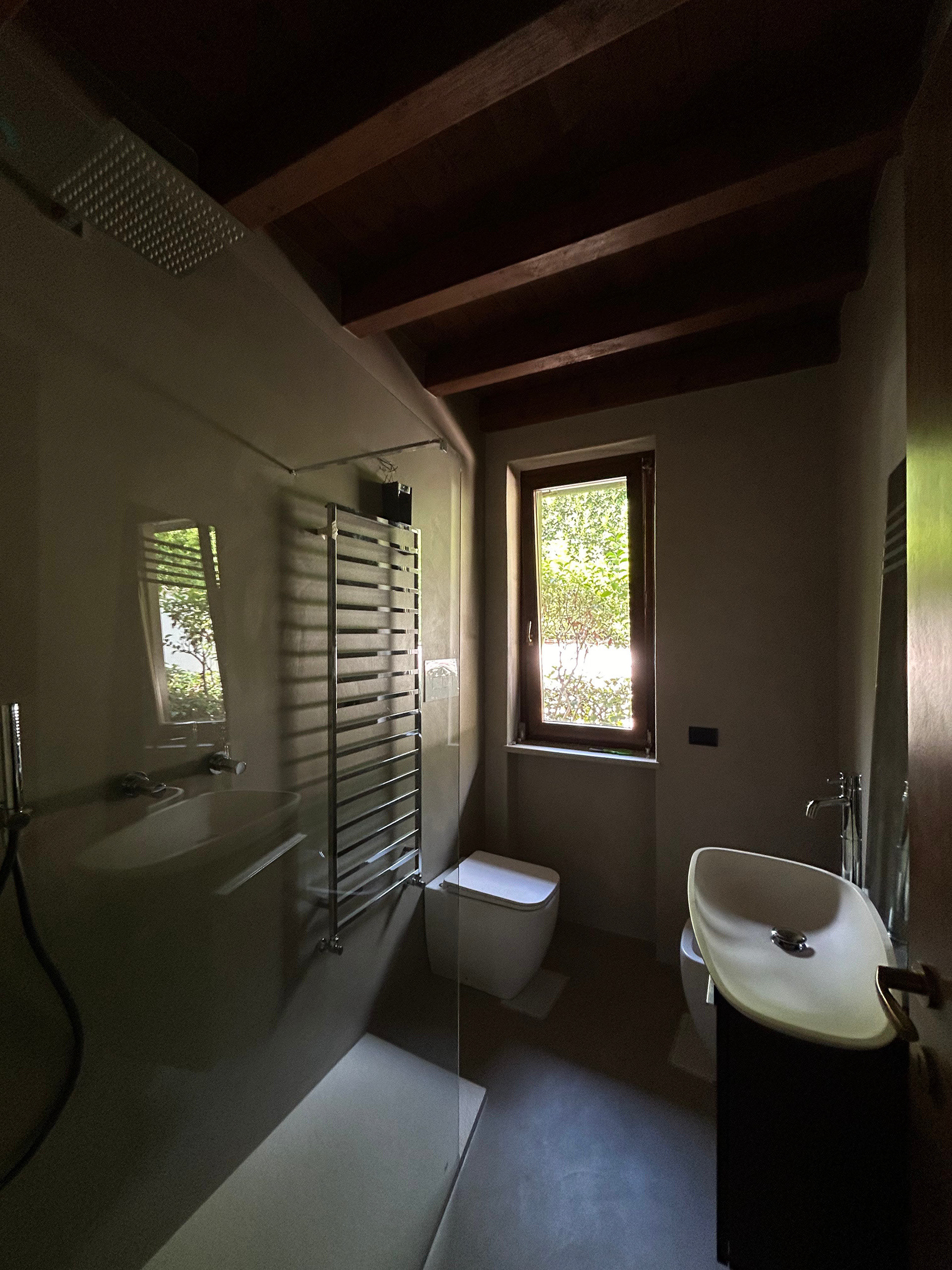 Bagno completamente rivestito in MICROCEMENTO, applicata a mano in più strati su PIASTRELLE GIà esistenti. Il materiale garantisce continuità visiva, impermeabilità e alta resistenza all’usura.
