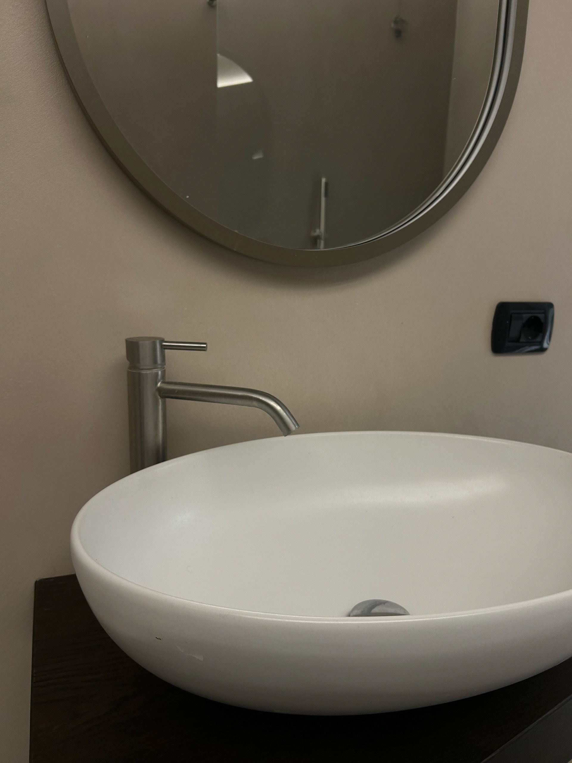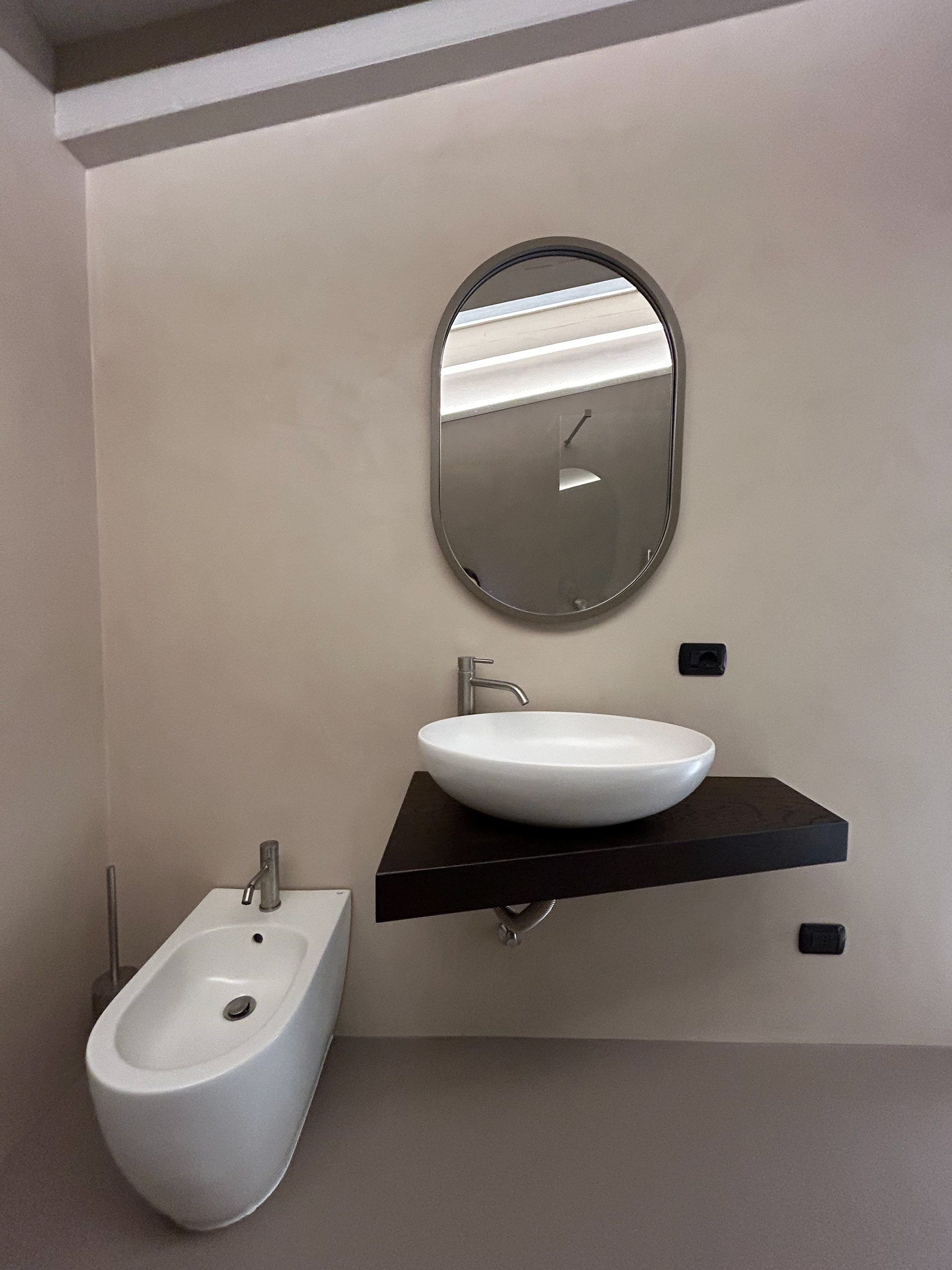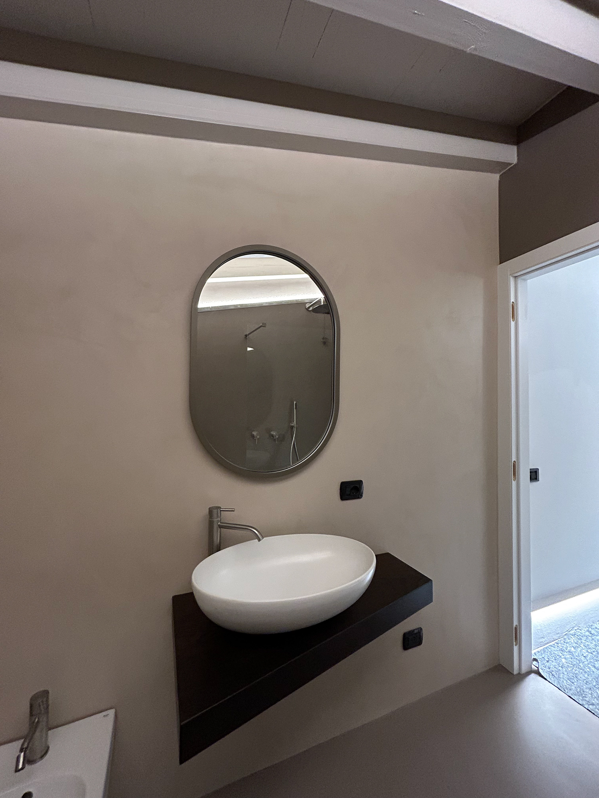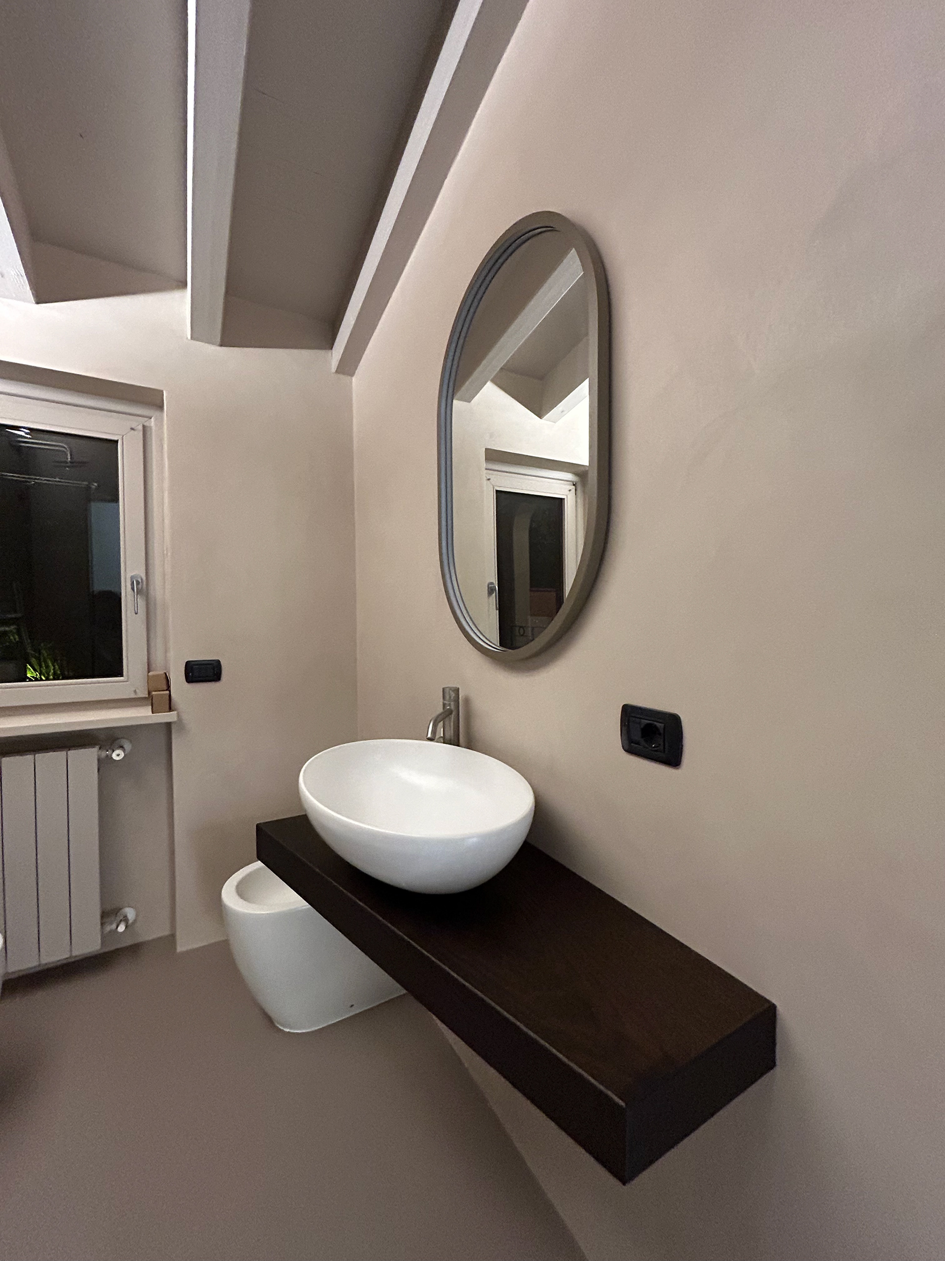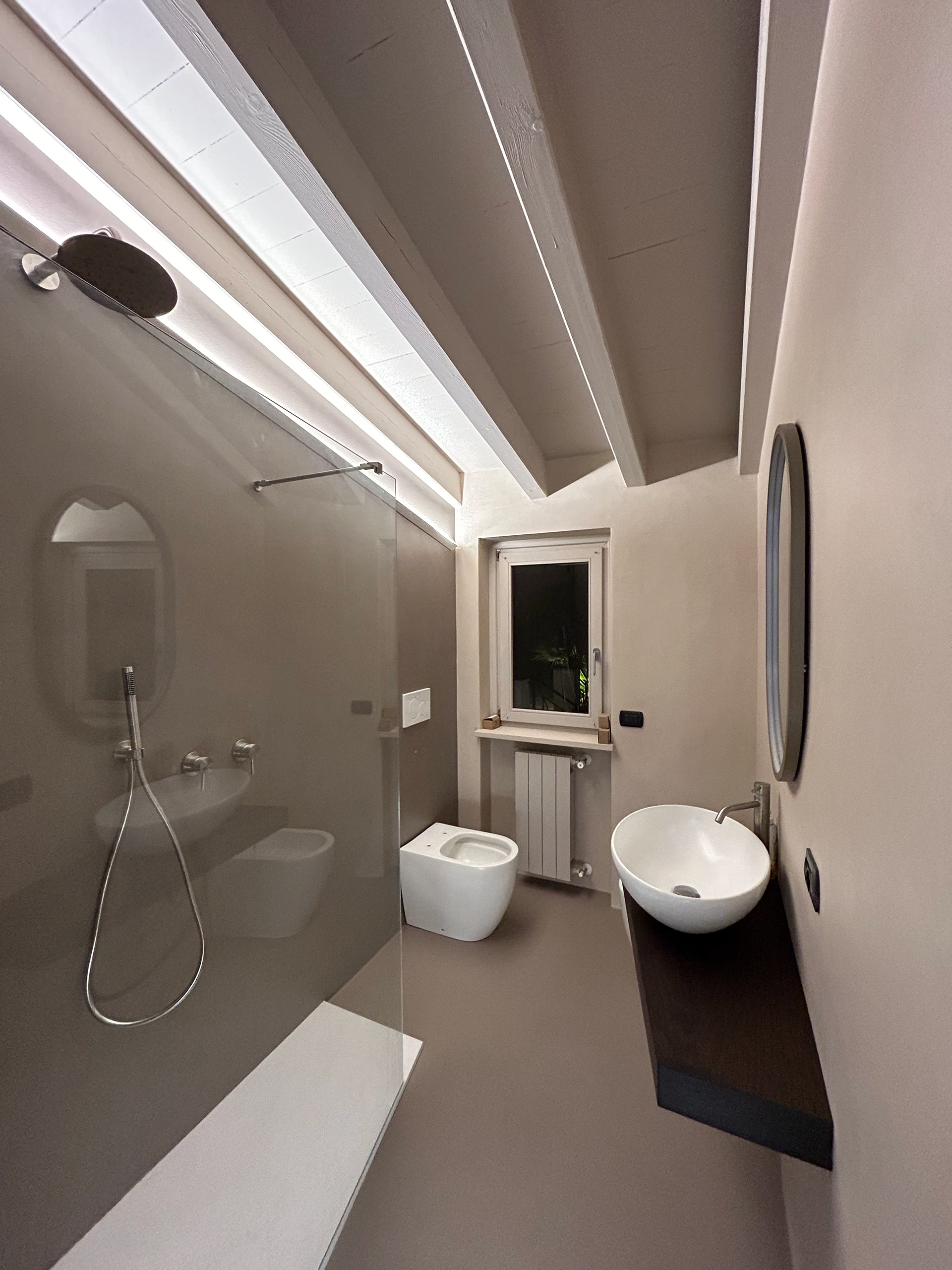 In questa nuova realizzazione abbiamo rivestito l’intero bagno in micro cemento, un materiale caratterizzato da una superficie uniforme, compatta e dal forte effetto materico.